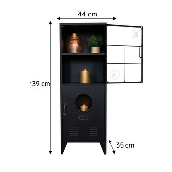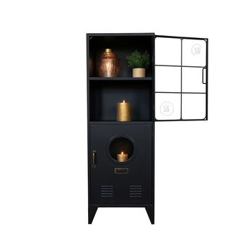 This Tall Black & Gold Industrial Storage Cabinet is neutral, retro designed furniture piece that will make striking storage for any bedroom, office or living room space. Crafted from metal and glass, this unit has a sleek, minimal design and 4 storage shelves. This cabinet comes with a 6 glass panelled design door front a sleek black finish and brass metal pull handles.