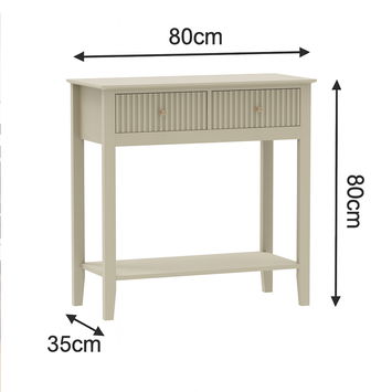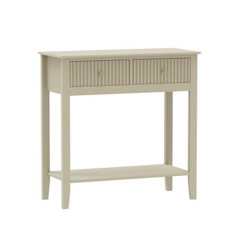 This Taupe 2 Drawer Console / Dressing Table from the Hales Taupe Range is a well crafted, beautiful storage table, perfect for placing in a bedroom, hallway or dressing room space. Made of wood and metal, this console table has a two drawer design. This piece comes with fluted detailing and a taupe finish. This item comes with your choice of gold or black metal handles.